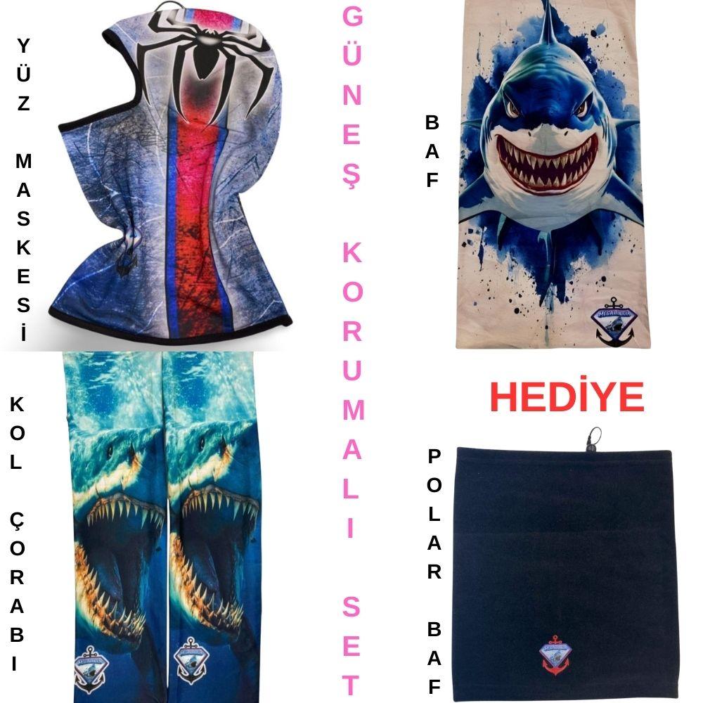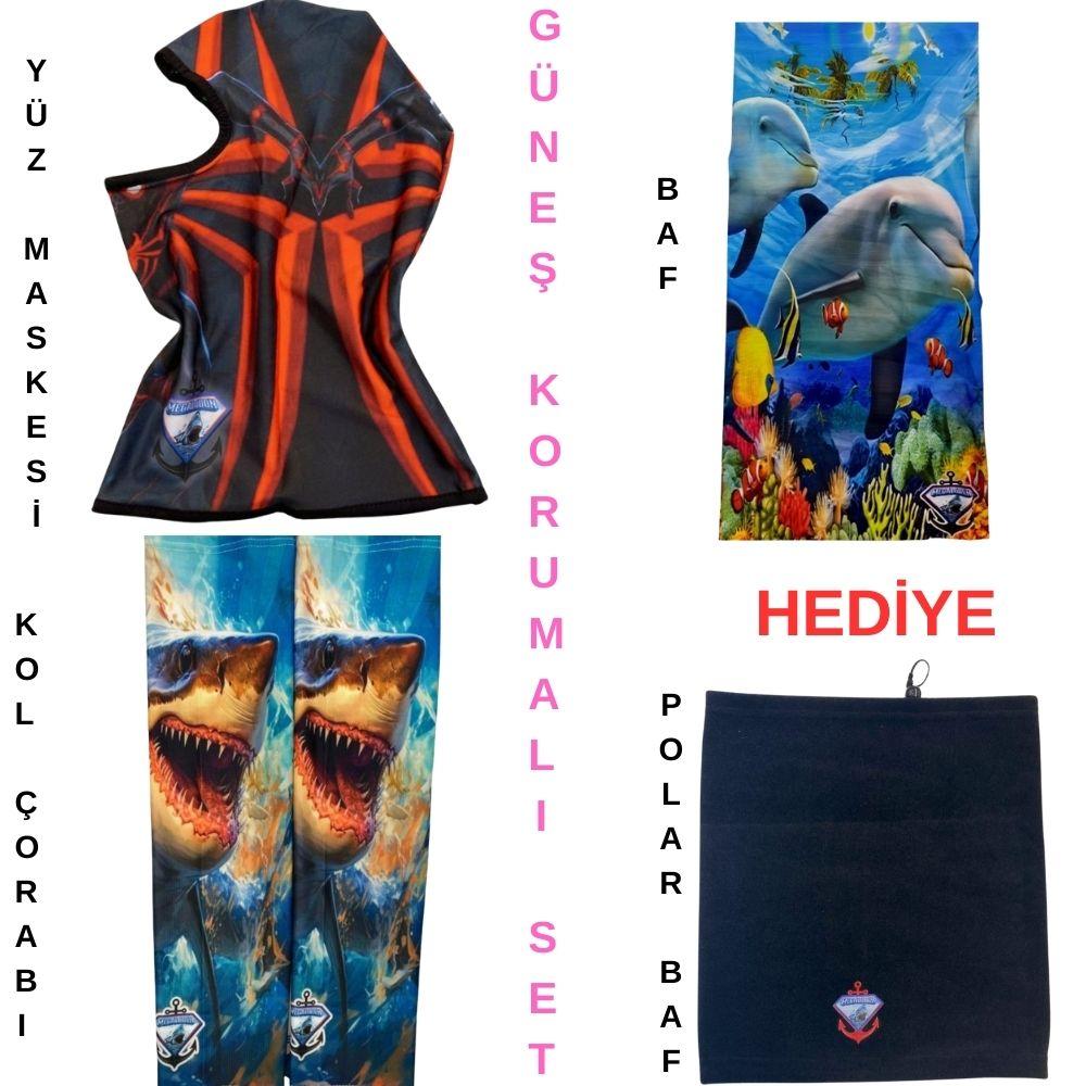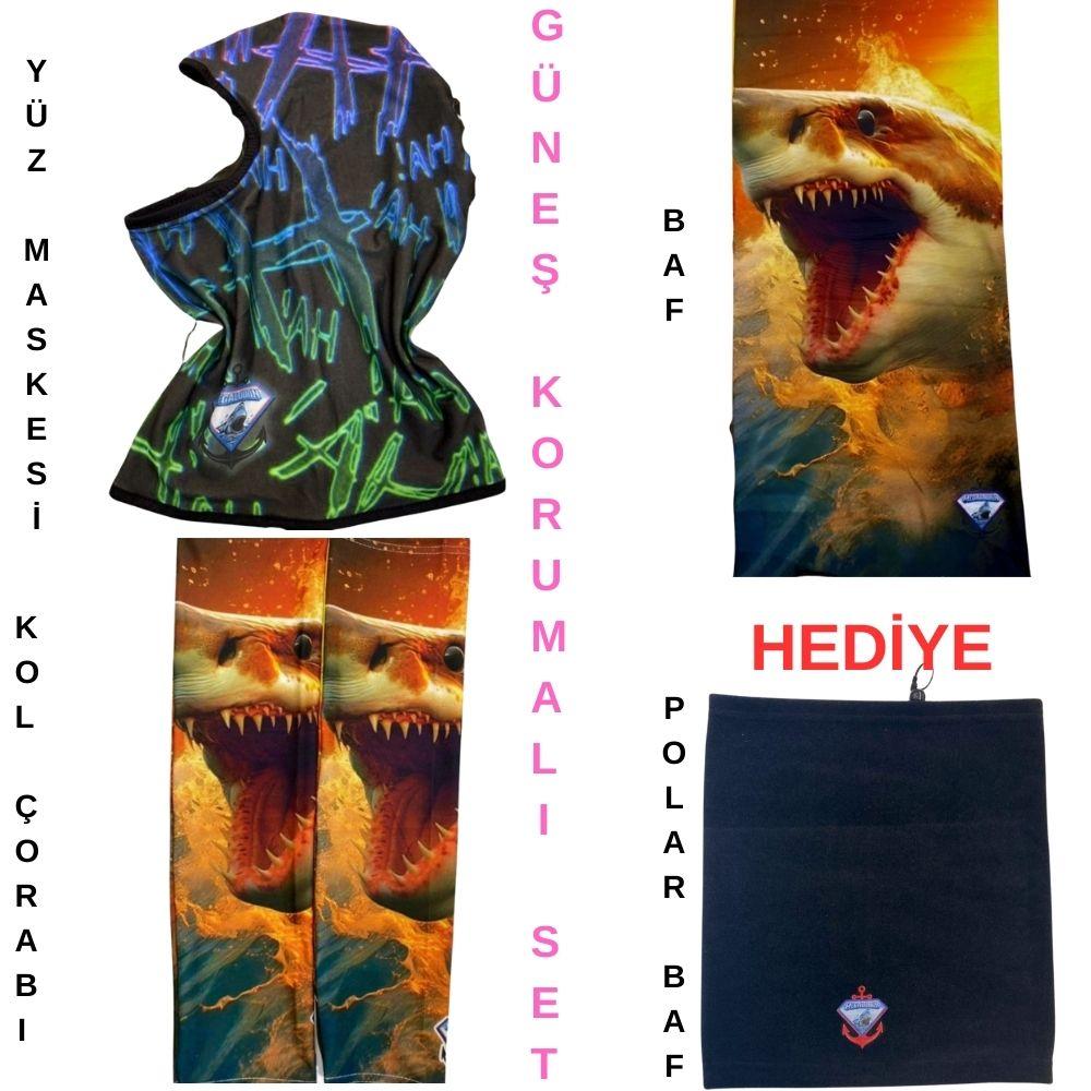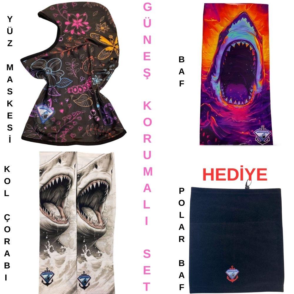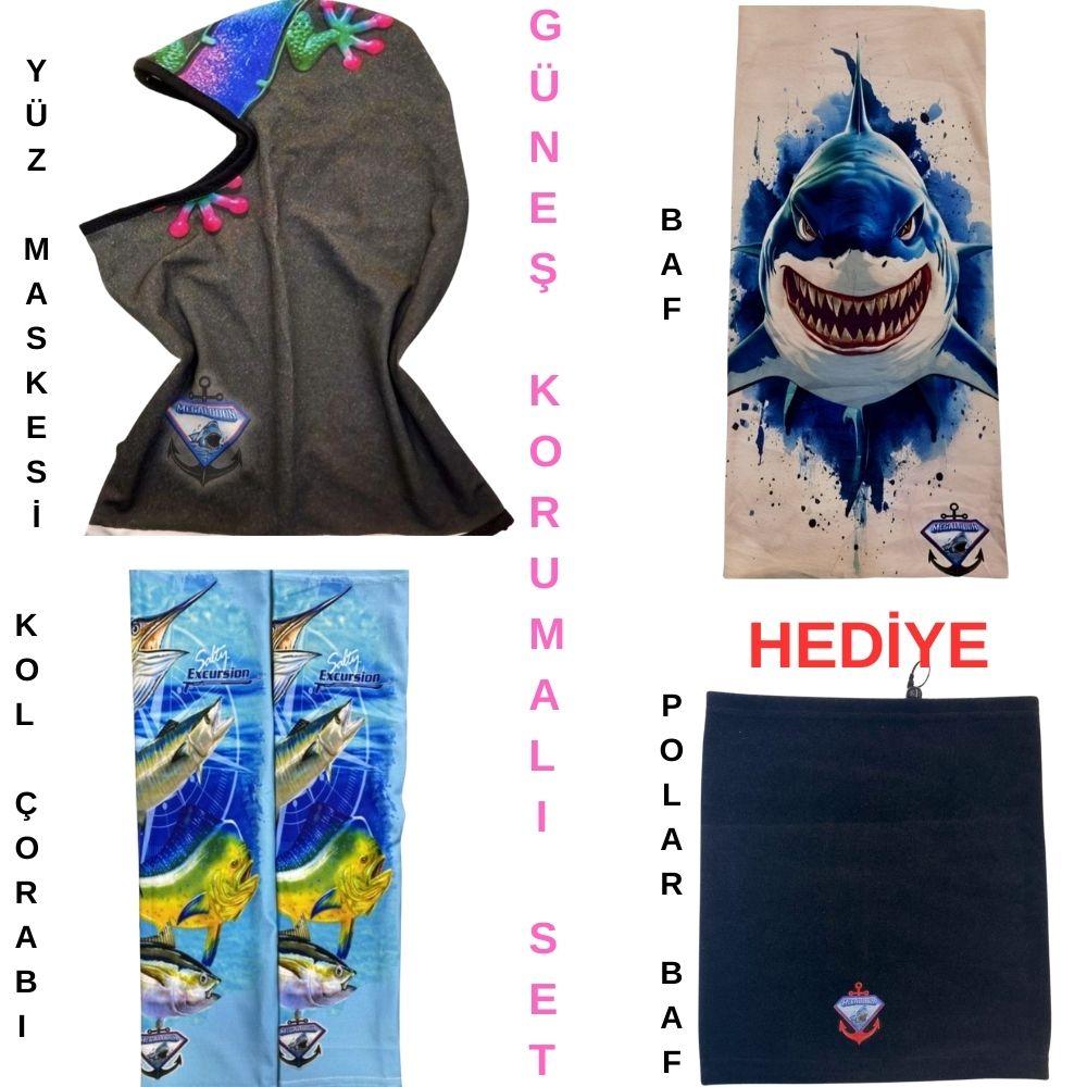 Megalodon UV güneş korumalı balıkçı seti, uzun süre güneş altında yapılan balık avlarında maksimum koruma sağlamak için tasarlanmıştır. Set içerisinde bulunan baf, kol çorabı ve yüz maskesi sayesinde balıkçılar güneş ışınlarına karşı korunurken aynı zamanda rahat bir av deneyimi yaşar.